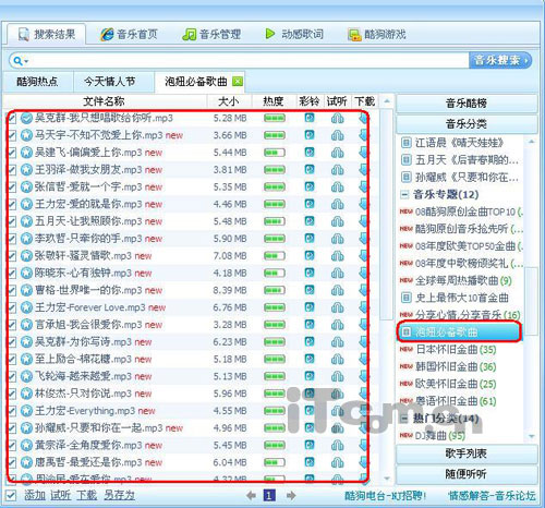 第二步:找一些能表达我爱意的歌曲了。立即登陆了平时爱用的“酷狗音乐”,先在软件的“音乐分类”区里面逛了一圈,居然在“音乐专题”下,看到了“泡妞必备歌曲”专题,哈哈,太有意思了,很合我意嘛。选了两首能表达我想对她说出的话的歌曲,同时也通过“音乐搜索”很快搜索到了几首她平时喜欢的歌曲。