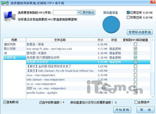 第三步,便是将我精心挑选的这些歌曲连同歌词一并传到MP3里。在这里再次使用了“酷狗音乐”这个好帮手,在“音乐管理”里,点击“复制到MP3或手机”