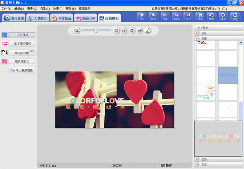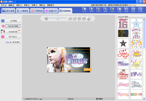 点击《美图大师》的“超酷模板”页面标签,然后在左侧按下“文字模板”按钮,就能在右侧的“饰品展示”区中看到很多漂亮的装饰性文字了。选一段放进图片,再用鼠标对文字位置进行调整……做到这一步,这张美女签名图就已经很有味道了。如果感到满意,就赶紧点“另存”按钮把它保存下来吧!