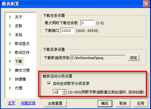 打开酷我音乐盒后,依次点击“设置”→“选项设置”→“下载”选项,勾选“自动生成歌手分类目录”选框,在下方输入一个数值,比如10,点击“确定”按钮即可应用。以后再用酷我音乐盒下载歌曲时,只要同一个歌手的歌曲超过10首,酷我音乐盒就会自动为该歌手创建一个保存目录,将该歌手的歌曲全部转移到该目录下保存,日后再下载了该歌手的其它歌曲,也会自动保存到该目录下。这样无须手动操作即可自动分类保存下载歌曲,以后再管理歌曲是不是就方便多了。