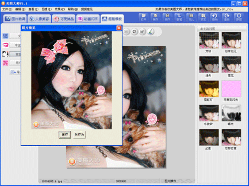 这款号称“比PS简单100倍”的软件,可帮了我的大忙。整体试用下来后效果很不错,连我这样的菜鸟也马上会用了。屁颠屁颠的把这几张图献给MM,她QQ空间里的朋友们都很羡慕!要是你有心怡的MM,赶紧用这样的方法试试吧!