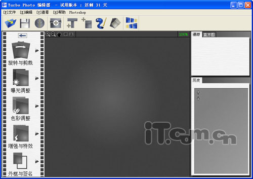 软件界面首先就给我们一种很“数码”的感觉。继续深入就会发现,虽然软件体积不大,但在功能上却涵盖了绘图、编辑、特效、添加边框等功能,可谓是一应俱全,并且做出来的图像效果非常棒。通过Turbo Photo打开一张数码照片时,会弹出图像处理向导窗口,单击向导界面中的处理项即可进入相应的编辑功能窗口,如图6所示。