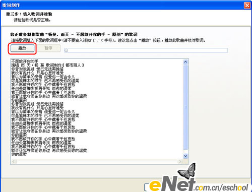 第四步:要对歌词进行制作,首先要填入歌词并检验歌词的准确性——在“填入歌词并校验”页面。在空白处填入需要制作的歌词,当歌曲本身具备有歌词时,该处的歌词是自动提取本地的LRC歌词。你也可以点击图4中的“播放”按钮,一边试听一边检验歌词。如果嫌麻烦,也可以下载使用别人已经录入的歌词,在这里进行重新编辑,打造完全属于你的歌词页面。(如图4所示)