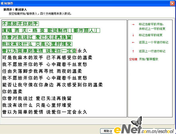 第五步:制作歌词,这是酷狗动感歌词制作过程中最享受的一步了——跟着音乐节奏,敲打着键盘上的方向键就可以完成歌词的制作,就像弹钢琴一样。不过,这里要注意的是,如果你对这首歌不熟的话,请先多试听几遍,让自己大概记得歌曲的旋律,然后,根据所演唱的歌曲内容,逐字敲下向右的方向键就可以了;如果有错误,可以使用向左和向上的方向键来更正(如图5中所提示);如制作中有事要离开,使用空格键暂停即可。注意在制作的时候,你键入歌词的准确性直接影响了歌词的质量哦,如需要编辑高质量的歌词,请不妨多试几次,让自己发挥最好的水平。