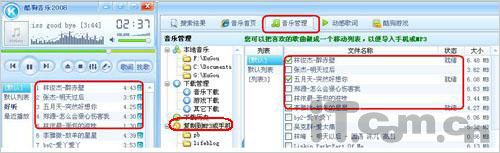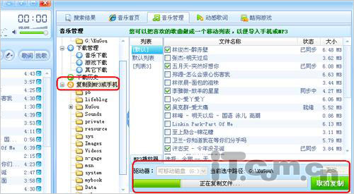 第二步、点击“音乐管理”按钮,在这里所试听的在线播放音乐将同步到“音乐管理”中的列表中,点击复制到MP3或手机”按钮,再勾选所要上传到移动设备的歌曲(如图2所示)