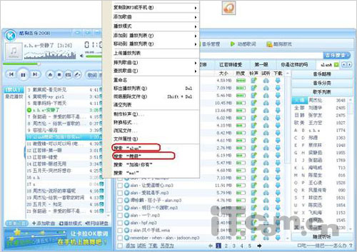 方法二:右键点击播放列表的歌曲名,将弹出搜索对话框,这时歌曲名称上包含的所有字符都可以作为关键字被搜索,比如ALAN和魏晨合唱歌曲,不仅可以查到歌手魏晨的相关歌曲,ALAN的歌曲也一并可以被搜索到。(如图八)