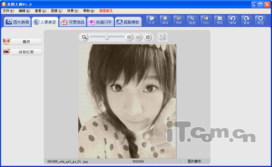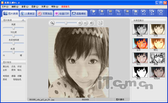 首先登陆美图大师官网(www.meitudashi.com)下载安装上美图大师。打开需要处理的图片,在第一个“图片微调”标签中我们可以看到除为我们提供了亮度、对比度等四项基本数据调整外,还内置了十几种图片特效。我们先点右侧“效果图展示”区域的“怀旧”,图片立即变成了怀旧效果;然后再点“电视线”给图片加上抽线效果(如图2)。