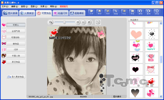 第一步的基本美容,加整体颜色效果我们做完了,接下来,进一步美化装饰图片。选择“可爱饰品”标签,在这里我们可以看出软件将上百种图片饰品分成了七大分类供我们选择使用。根据图片整体呈现的灰暗效果,我选择了“可爱心、闪字、其他饰品”中的三个灰色的小饰品加入到图片中,来承托图片的整体效果(如图4)。