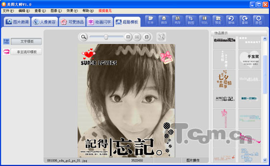 这一步是加入非主流元素最重要的一步,选择“超酷模板”标签,这里提供了好多时下流行的非主流元素,分成了“文字”和“非主流印”两类。选择“文字模板”项,依次浏览非主流文字模板,感觉其中一个写着“记得忘记”的图挺适合我的,就用它吧,点击一下将它加入到图片中,调整其位置到图片下部(如图5)