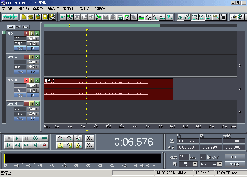 也是在预置当中的选项中找一种合适的供你使用,别忘了先把"预览"打开哦~~调整好预加的效果就点确定吧。个人认为,如果混响加的太多的话会使人声显得模糊过于假,加的少又会使声音显得很干很涩,大家慢慢摸索,多录几次后就有经验了。 完毕,点击轨道切换按钮返回到多轨模式下,试听。