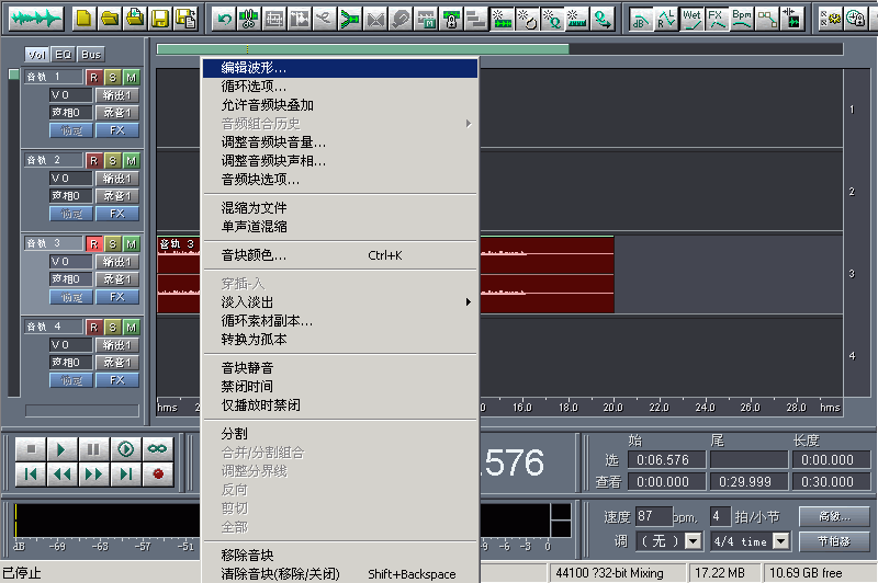 10、怎么样?听到了吗?满意吗?还可以是吗?如果觉得你录制的声音音量偏小,那么就右键点击“调整音频块音量”,直到两轨的声音达到你满意的程度为止。下面就把这两个音轨混缩成一个音轨吧。在第三轨上右键单击,弹出菜单中选择“混缩所有波形文件”。