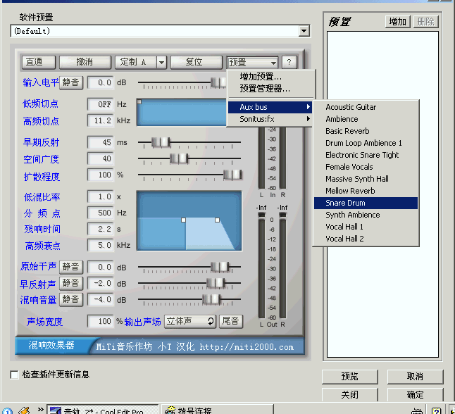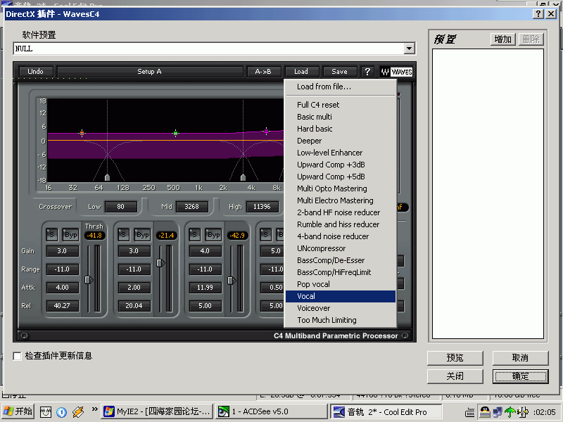 先点击BBESonicMaxizer,点击预览,在预置中已经有很多种选项可供你选择,也可以自己调,点击确定完成这一步。然后再打开waveC4,重复以上步骤。