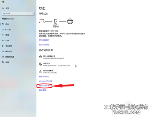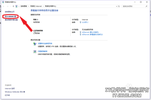进入网络与Internet选项设置后,点击网络和共享中心,再点击更改适配器设置