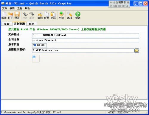 经过Quick Batch File Compiler编译的程序,可以自定义程序的图标以及版本信息等,这样不仅批处理文件的内容可以加密保护防止被修改,连程序图标都名副其实了。现在就让我们来做一个。