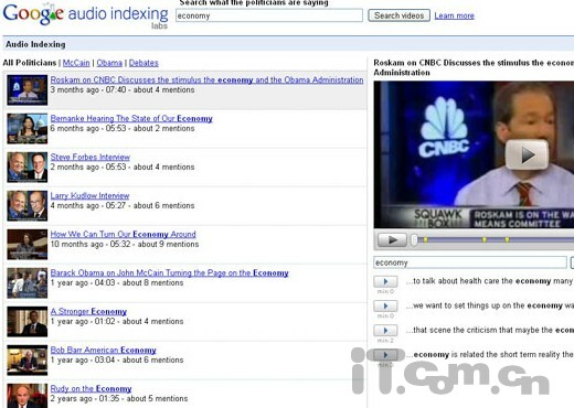 Google Audio Indexing是Google的声音搜索,它能透过语音辨识系统将影片中的语音部分转换成文字,之后再藉由文字搜寻,即可将影片中包含搜寻文字的部分清楚标示。目前该服务仅提供英文的政治领导人的影音演讲检索。