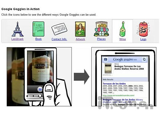 Google Goggles是一个有趣的创新,它基本上实现了“视觉搜索”——使用Android手机拍摄照片即可搜索相关信息。 Google Goggles是一款Android平台软件,Android手机用户登录软件商店即可下载。在该软件中,用手机摄像头拍摄当地地标建筑、书籍封面、艺术作品、酒类标签以及产品商标,即可立即获得相关信息。拍摄名片能够记录所有信息,直接拨打电话或加入通讯录。对于商业网点的识别,则连拍照都省略了,采用类似“增强现实”技术的方式,将摄像头指向该店铺,Android系统即可利用 GPS、电子罗盘信息,给出该店铺名称和更多信息。Google还表示,未来会给Goggles增加更多识别能力,比如识别植物等。