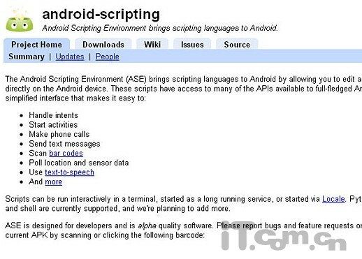 Android Scripting Environment(ASE),将脚本语言带入Android,允许用户编辑和执行脚本,直接在Android设备上运行交互式解释器。脚本将能大幅度简化任务界面,用户能在交互式终端中使用脚本。ASE目前支持Python,Lua和 BeanShell,未来将加入对Ruby和JavaScript的支持。