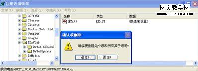 首先我们来打开注册表,执行“开始→运行”:regedit 。在HKEY_LOCAL_MACHIN中选择SOFTWARE项,然后再选择IDALab。嘿嘿,原来是计划更新和计划任务的注册项在做怪。OK。那我们来把他们直接删除。在IDALab的上点右键,然后删除,然后选择“是”如图所示: