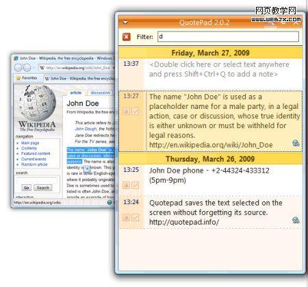 Quotepad可以快速摘抄网页上的文字并汇总,非常适合从网络上采集素材,或是将多个资料整理到一起时使用。快捷键的整合也使quotepad的操作更加方便,而且quotepad还会自动保存内容的来源网站,这样就可以通过便签来访问来源网站了。