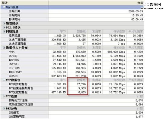我们首先了解网络的整体运行状态,在概要统计视图中可以看到:网络的总共流量为1.828GB,而利用率则达到了近80%,这是网络缓慢的一个重要指示参数。我们再看TCP的参数信息,此处,TCP的同步数据包与结束连接数据包分别是17796和9963个,由TCP的工作原理我们知道,TCP在工作时首先会通过三次握手建立连接,数据传输完成后,必须关闭连接,在建立握手的时候,会产生2个同步数据包,而关闭连接的时候,也会产生2个同步数据包,所以,理论情况下,1个TCP连接的同步数据包与结束连接数据包应该大致相等,如果二者的数据包相差较大,说明当前的网络传输不正常。如图1。