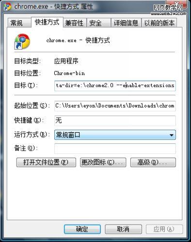 Chrome.exe --user-data-dir=e:chrome2.0 --enable-extensions。如图:
