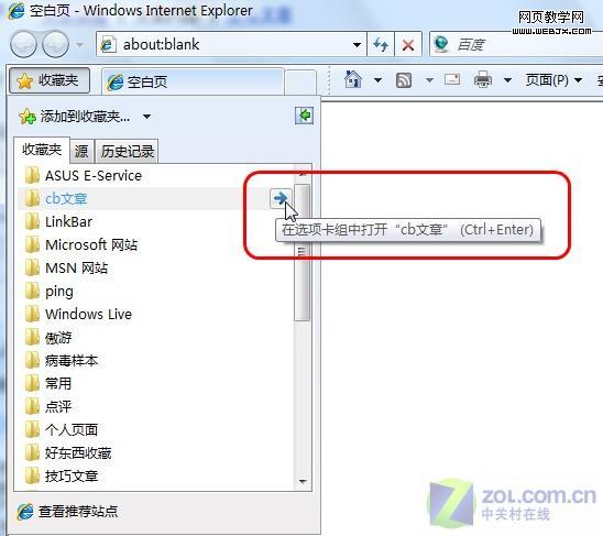 实现方法非常简单,用户启动IE浏览器后,切换到“收藏夹”选项,此时选中相应的收藏夹目录。用户便会发现会出现一个 (蓝色箭头)图标。此时直接单击此图标,IE浏览器便会在东在选项卡组中打开相应目录下所有收藏地址,轻松实现其它浏览器的“快捷组”功能。
