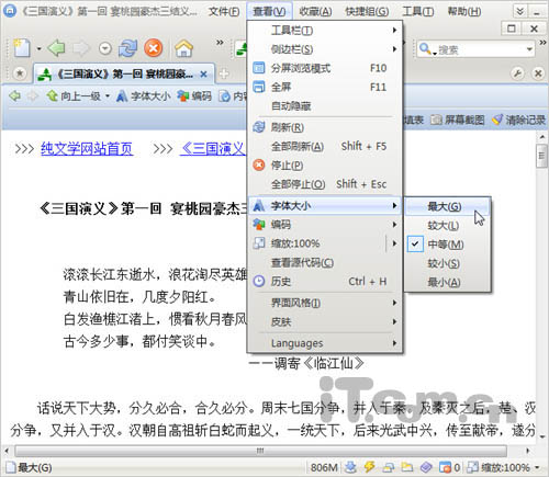 设置方法非常简单,用户在使用傲游浏览器打开相应阅读页面之后,点击“工具”菜单中的“字体大小”,选择子菜单中的“最大”或“较大”,即可自动对当前页面的字体进行放大,方便用户更好的阅读电子书籍(如图2)。