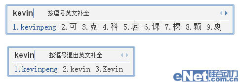 同时,小编还发现QQ拼音英文输入同样支持记录用户输入习惯及自造词。QQ拼音不但可以记录用户输入的新英文词及输入英文词的频度、时间等信息,还可以智能的根据用户的输入习惯调整单词的排序,如输入kevinpeng,再输入kevin,我们就可以看到kevinpeng已经被自动列为最优选词了。而如果我们不想保留自造词只要用Ctrl+数字键在所有模式下都可以将其快捷删除。