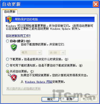 为保险起见,还可以打开“控制面板”,双击“自动更新”,然后选择“关闭自动更新”项,单击“确定”按钮确认(如图2),这样就可以阻止Windows XP本身的补丁部署功能。