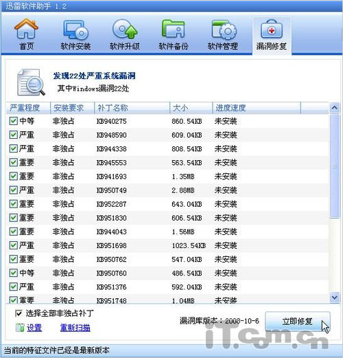 经过上面的操作后,系统补丁功能已经被禁止了。如果还有危险,怎么办?不要紧张,我们可以先从http://www.xunlei.com处下载并安装最新的“迅雷5”,再从http://down.sandai.net/bibei/XLSoftManager.exe处下载并安装“迅雷软件助手”。之后启动迅雷5,我们可以看到“系统漏洞修复”项,单击后会打开迅雷软件助手窗口。单击工具栏上的“漏洞修复”按钮,即可看到如图3所示窗口,我们就能用它来为系统打补丁了。