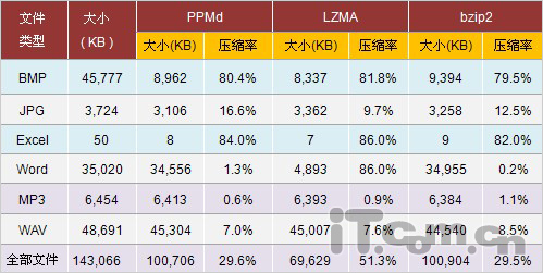 从测试结果来看,全新加入的LZMA算法,果然没有让我们失望。无论是单一文件还是多文件共同压缩,LZMA的压缩率一直高于其他算法。而最终令它出名的,还是Word文档的压缩。正是这个高出同伴整整80倍的超高压缩率,最终使得LZMA的总压缩成绩,达到了惊人的51.3%,远远高于同类算法。