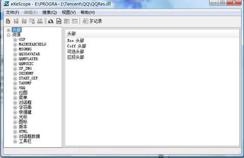 1.安装运行eXeScope,依次点击“文件”-“打开” 用eXeScope打开在QQ安装目录下的QQreg.dll如下图。