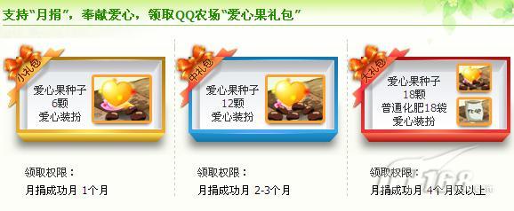 活动内容:凡于3月1日至3月31日开通或续捐“月捐计划”的爱心网友,都可以根据月捐成功月的不同,领取QQ农场独家奉献 的爱心果礼包1份。同时,领取大礼包和中礼包的爱心网友还有更多种子可赠送好友。
