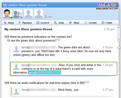 你可在信息的任何地方做回应,你也可在一般e-mail中进行,不过在Wave中,你的回应很容易被看见,因为这个应用会在回应的文字加入彩色方块,并嵌入作者的照片。若你是那种喜欢直接从信头或信尾做回应的,那就当作一般e-mail即可。若你喜欢从内文中逐段回应,那么Wave的作法可说十分轻松。