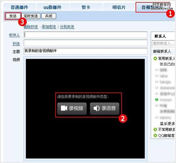 给好友发送音视频邮件,进入写信页面后,按以下三个步骤操作即可。