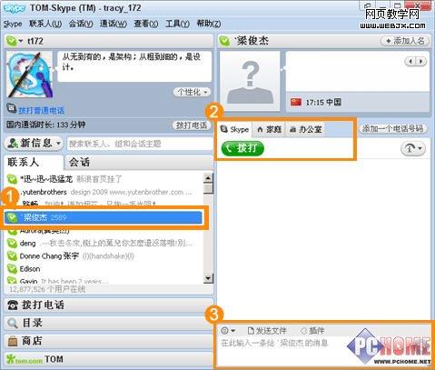 同时,用户还能够在这个标签中方便地对Skype、固定电话或手机用户发起语音或视频通话,发送即时消息或短信也能够在同一窗口中完成。为了照顾不同用户的使用习惯,Skype 4.0简体中文正式版包含了两种窗口布局模式。其中默认视图是把所有的功能和对话都集成到了一个单独的窗口中,而精简视图则允许用户在新窗口中建立会话。