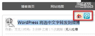 最近在看腾讯新闻的时候,无意中发现,当我选中新闻中的文字的时候,鼠标右上角会显示一个“转播至微博”的按钮,点击后就会将选中的文字转发到微博上。这是一个很不错的用户体验,如果能把它引入到WordPress博客中,那不是很好吗?