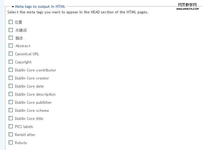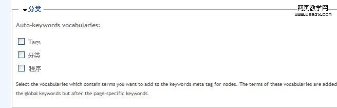 9.设置自动关键字,即系统会为你节点自动添加关键字meta tag,当你勾上了其中某项(来自词汇内)时,其内术语将显示在全局关键字前,具体页面关键字后。