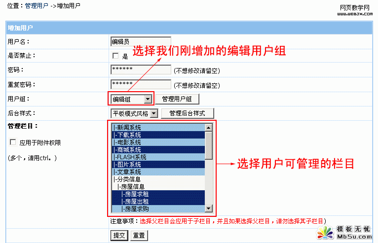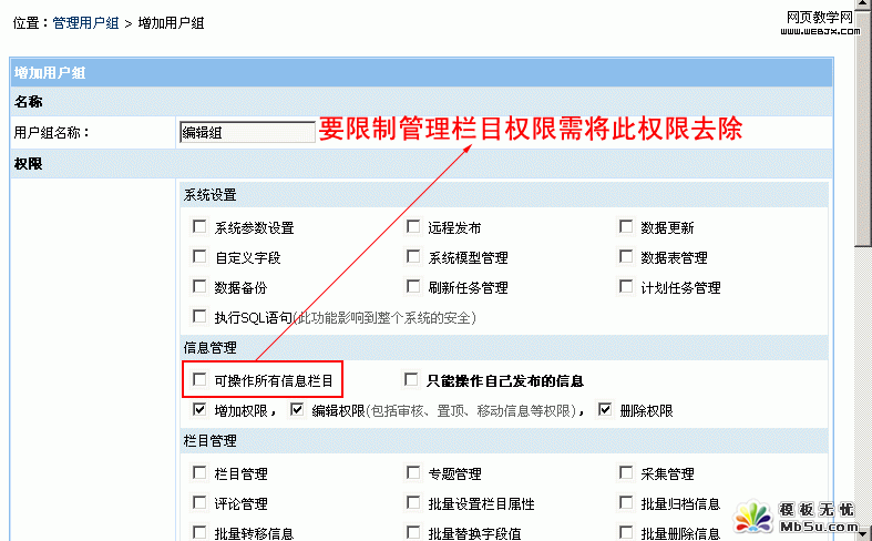 1、增加用户组需去除“可操作所有信息栏目”权限