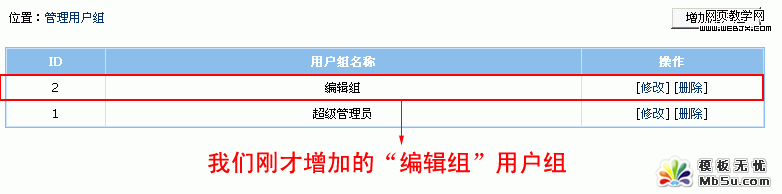 2、增加用户组后,返回管理用户组,我们会看到刚才增加的“编辑组”用户组,如下图: