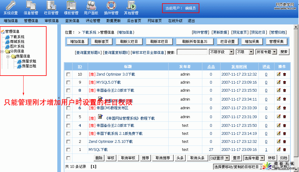 三、我们用刚才增加的“编辑员”帐号登陆后台,帐号登陆后界面如下: