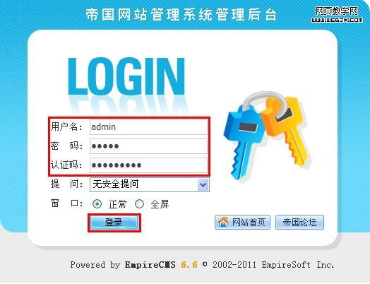 进入网站后台登陆界面,输入安装时设置好管理员账号用户名、密码和认证码,单击【登录】按钮。 后台访问地址是:http://您的网站域名/e/admin。 |