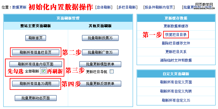 在安装过程第四步【配置数据库】中,如您勾选了【内置初始数据】选项,安装成功后,还要进行内置数据的初始化操作: 依次单击【恢复栏目目录】按钮、【刷新所有信息栏目页】按钮、 勾选“全部刷新”后单击【刷新所有信息内容页面】按钮、【刷新所有JS调用】按钮,出现“成功”或“完毕”字样即可。