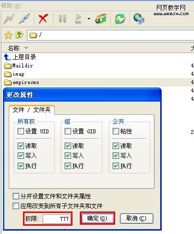 目录上传完毕后,设置目录属性,使文件可以被 EmpireCMS 正确读写。 (如果您的服务器使用 Windows 操作系统+Apache,目录权限一般默认就可读写,可以跳过设置目录属性这一步骤操作; (如果您的服务器使用 Windows 操作系统+IIS,需要设置IIS 来宾帐户可读写属性; (linux服务器,可以使用ftp软件将目录、文件属性设置为777 ;如果有shell权限,也可以通过执行chmod来修改目录权限。 本文以Linux空间目录属性设置为例,保持FTP软件链接您的空间或服务器,然后 ·将网站根目录“/”的属性设置为 777: 选取要设置属性的根目录,单击右键>属性,权限:777,单击“确定”按钮。 |