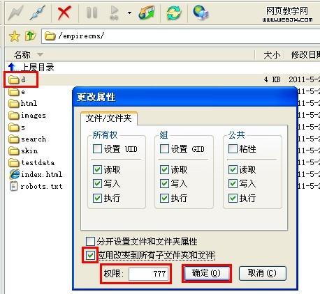 "/d"目录属性设置方式如下图所示,其他目录及文件属性设置参考d目录设置方法。 选取要设置属性的目录d,单击右键>属性, 勾选“应用改变到所有子文件夹与文件” 权限:777,单击“确定”按钮。