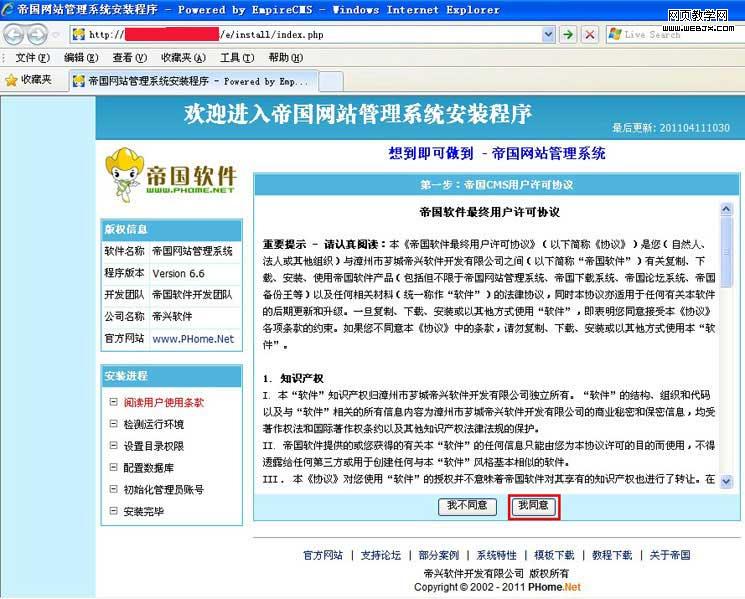 帝国CMS是以网页的方式进行安装的, 打开浏览器,在地址栏中输入http://您的网站域名/e/install/index.php 运行, 出现如下图所示的帝国CMS安装界面,页面左侧导航栏分别显示版权信息和当前安装进程;页面中部显示的是帝国CMS使用许可协议, 阅读许可协议,然后单击【我同意】按钮: