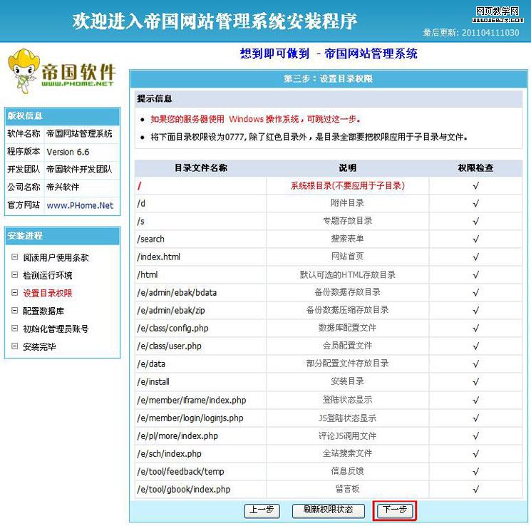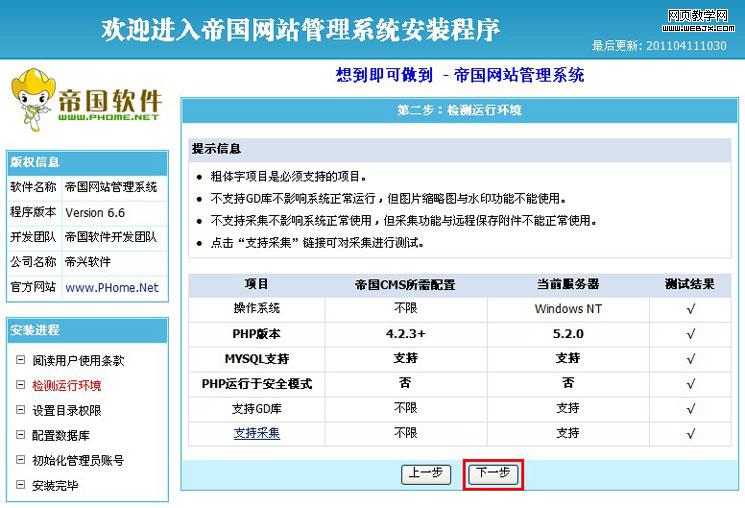 安装过程中,系统会自动检查您的空间或服务器的运行环境、目录文件的可读写权限状态,并具备一定的纠错功能。 如果您在之前某一步骤操作有问题,通常安装脚本会发现并以X提示,请您根据提示再对安装过程进行检查。 检测成功的运行环境和目录权限项目均为√显示,如下图所示,可以单击【下一步】按钮: |