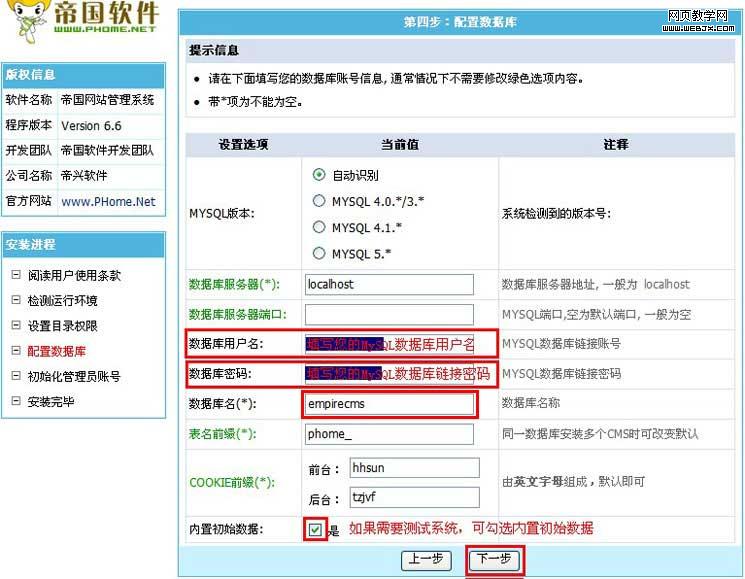 进入数据库配置界面,如下图所示: ·输入您的空间或服务器的MySQL数据库信息,MySQL数据库地址、数据库名、数据库用户名和数据库密码请咨询您的空间商或者服务器管理员。 ·内置初始数据:是帝国CMS系统的初始测试数据,提供数据演示功能。如勾选√本功能,则安装完毕后,网站将导入系统初始数据。 ·其他选项按默认即可,单击【下一步】按钮: |