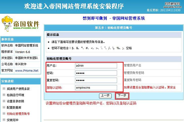 系统自动建立数据表成功后,就进入创建网站后台管理员账号信息界面,如下图所示: ·帝国CMS系统不设默认管理员账号,您可以自行创建网站后台管理员登陆用户名和密码。 ·登陆认证码:用于网站内部人员登录时的身份验证,具备双重密码效果,增强网站安全性。建议设置。 认证码可以包含中英文、特殊符号等任意字符。如果不需要认证码功能,可以设为空。 |