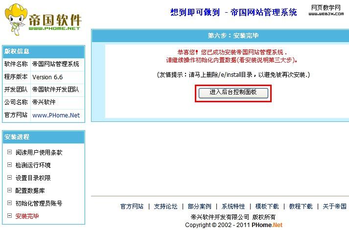 | 单击【下一步】按钮,出现安装成功界面,单击【进入后台控制面板】按钮:(并马上登录FTP里删除/e/install目录) |